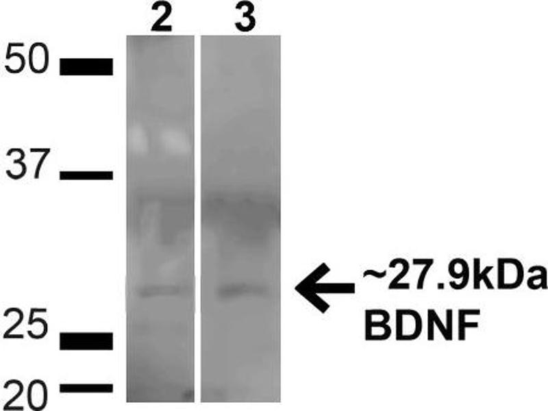 A 1:1000 dilution of ABIN2869087 was sufficient for detection of BDNF on 293T Rapamycin-treated lysates using Goat anti-rabbit IgG:HRP as the secondary antibody.