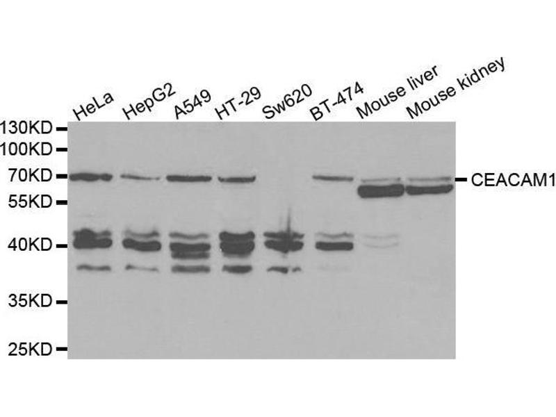 Der Kaninchen Polyklonal anti-CEACAM1 Antikörper wird verwendet zum Nachweis von CEACAM1 in Proben von Human. Er wurde validiert für WB und IHC.