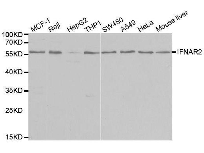 The protein encoded by this gene is a type I membrane protein that forms one of the two chains of a receptor for interferons alpha and beta. Binding and activation of the receptor stimulates Janus protein kinases, which in turn phosphorylate several proteins, including STAT1 and STAT2. Multiple transcript variants encoding at least two different isoforms have been found for this gene.,IFNAR2,IFN-R,IFN-alpha-REC,IFNABR,IFNARB,IMD45,Epigenetics & Nuclear Signaling,Cancer,Tumor immunology,Signal Transduction,Immunology & Inflammation,Cytokines,Interferons,Cell Intrinsic Innate Immunity Signaling Pathway,IFNAR2