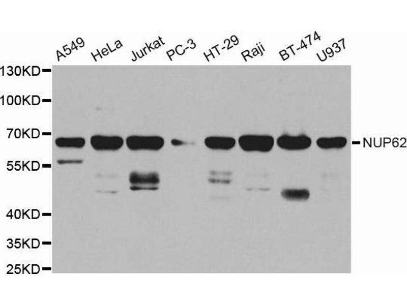 Der Kaninchen Polyklonal anti-NUP62 Antikörper (ABIN3016141) detektiert spezifisch NUP62 in WB.