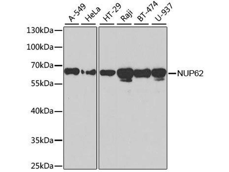 The nuclear pore complex is a massive structure that extends across the nuclear envelope, forming a gateway that regulates the flow of macromolecules between the nucleus and the cytoplasm. Nucleoporins are the main components of the nuclear pore complex in eukaryotic cells. The protein encoded by this gene is a member of the FG-repeat containing nucleoporins and is localized to the nuclear pore central plug. This protein associates with the importin alpha/beta complex which is involved in the import of proteins containing nuclear localization signals. Multiple transcript variants of this gene encode a single protein isoform.,NUP62,IBSN,SNDI,p62,Epigenetics & Nuclear Signaling,Nuclear Receptor Signaling,Signal Transduction,Cell Biology & Developmental Biology,Apoptosis,Growth factor,EGF,NUP62
