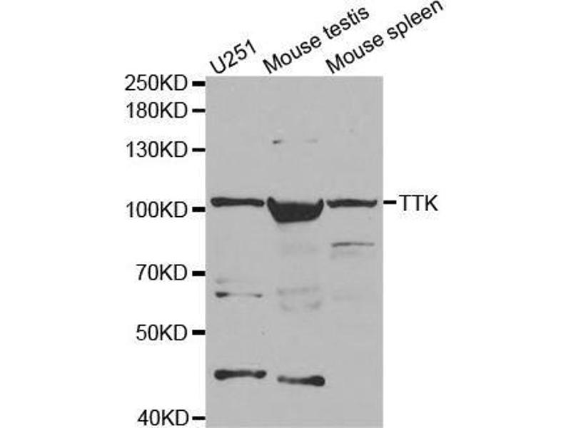 This gene encodes a dual specificity protein kinase with the ability to phosphorylate tyrosine, serine and threonine. Associated with cell proliferation, this protein is essential for chromosome alignment at the centromere during mitosis and is required for centrosome duplication. It has been found to be a critical mitotic checkpoint protein for accurate segregation of chromosomes during mitosis. Tumorigenesis may occur when this protein fails to degrade and produces excess centrosomes resulting in aberrant mitotic spindles. Alternative splicing results in multiple transcript variants.,TTK,CT96,ESK,MPH1,MPS1,MPS1L1,PYT,Epigenetics & Nuclear Signaling,Signal Transduction,Kinase,Cell Biology & Developmental Biology,Apoptosis,Cell Cycle,Centromere,TTK
