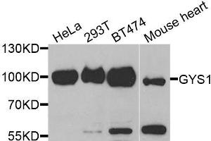 The protein encoded by this gene catalyzes the addition of glucose monomers to the growing glycogen molecule through the formation of alpha-1,4-glycoside linkages. Mutations in this gene are associated with muscle glycogen storage disease. Alternatively spliced transcript variants encoding different isoforms have been found for this gene.,GYS1,GSY,GYS,Cancer,Signal Transduction,PI3K-Akt Signaling Pathway,Cell Biology & Developmental Biology,Cytoskeleton,Actins,Endocrine & Metabolism,Carbohydrate metabolism,AMPK Signaling Pathway,Insulin Receptor Signaling Pathway,Endocrine and metabolic diseases,Diabetes,Obesity,Cardiovascular,Heart,Cardiovascular diseases,Heart disease,GYS1