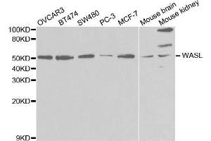 This gene encodes a member of the Wiskott-Aldrich syndrome (WAS) protein family. Wiskott-Aldrich syndrome proteins share similar domain structure, and associate with a variety of signaling molecules to alter the actin cytoskeleton. The encoded protein is highly expressed in neural tissues, and interacts with several proteins involved in cytoskeletal organization, including cell division control protein 42 (CDC42) and the actin-related protein-2/3 (ARP2/3) complex. The encoded protein may be involved in the formation of long actin microspikes, and in neurite extension.,WASL,N-WASP,NWASP,WASPB,Epigenetics & Nuclear Signaling,Signal Transduction,Cell Biology & Developmental Biology,Cytoskeleton,Microfilaments,WASL