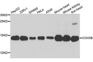 Cytochrome C oxidase (COX) is the terminal enzyme of the mitochondrial respiratory chain. It is a multi-subunit enzyme complex that couples the transfer of electrons from cytochrome c to molecular oxygen and contributes to a proton electrochemical gradient across the inner mitochondrial membrane. The complex consists of 13 mitochondrial- and nuclear-encoded subunits. The mitochondrially-encoded subunits perform the electron transfer and proton pumping activities. The functions of the nuclear-encoded subunits are unknown but they may play a role in the regulation and assembly of the complex. This gene encodes the nuclear-encoded subunit Vb of the human mitochondrial respiratory chain enzyme.,COX5B,COXVB,Cancer,Signal Transduction,Endocrine & Metabolism,Mitochondrial metabolism,Mitochondrial markers,Oxidative phosphorylation,Neuroscience,Neurodegenerative Diseases,COX5B