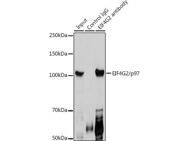 Translation initiation is mediated by specific recognition of the cap structure by eukaryotic translation initiation factor 4F (eIF4F), which is a cap binding protein complex that consists of three subunits: eIF4A, eIF4E and eIF4G. The protein encoded by this gene shares similarity with the C-terminal region of eIF4G that contains the binding sites for eIF4A and eIF3, eIF4G, in addition, contains a binding site for eIF4E at the N-terminus. Unlike eIF4G, which supports cap-dependent and independent translation, this gene product functions as a general repressor of translation by forming translationally inactive complexes. In vitro and in vivo studies indicate that translation of this mRNA initiates exclusively at a non-AUG (GUG) codon. Alternatively spliced transcript variants encoding different isoforms of this gene have been described.,EIF4G2,AAG1,DAP5,NAT1,P97,Epigenetics & Nuclear Signaling,RNA Binding,Cell Biology & Developmental Biology,Apoptosis,EIF4G2