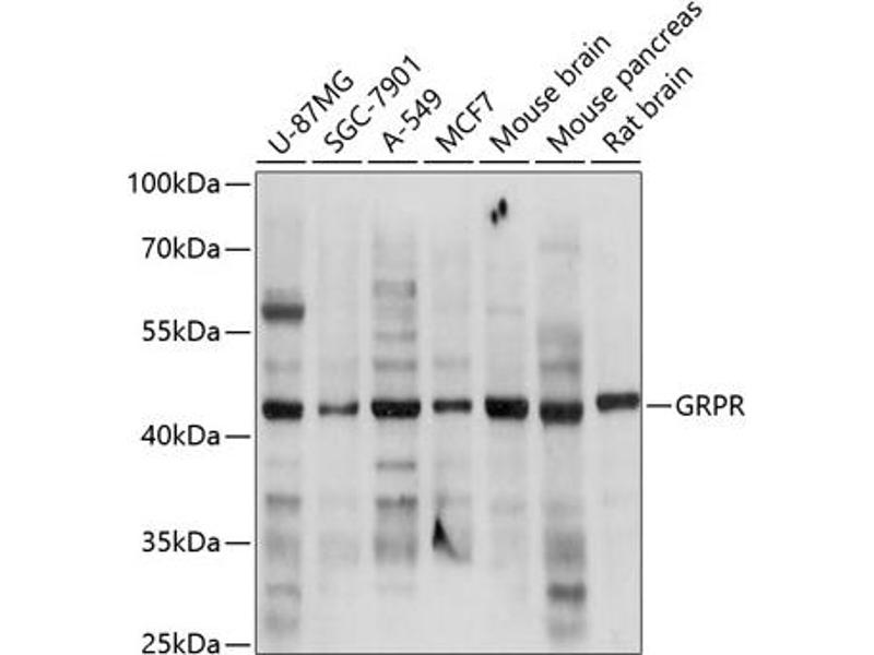 Gastrin-releasing peptide (GRP) regulates numerous functions of the gastrointestinal and central nervous systems, including release of gastrointestinal hormones, smooth muscle cell contraction, and epithelial cell proliferation and is a potent mitogen for neoplastic tissues. The effects of GRP are mediated through the gastrin-releasing peptide receptor. This receptor is a glycosylated, 7-transmembrane G-protein coupled receptor that activates the phospholipase C signaling pathway. The receptor is aberrantly expressed in numerous cancers such as those of the lung, colon, and prostate. An individual with autism and multiple exostoses was found to have a balanced translocation between chromosome 8 and a chromosome X breakpoint located within the gastrin-releasing peptide receptor gene.,GRPR,BB2,BB2R,Signal Transduction,G protein signaling,G-Protein-Coupled Receptors(GPCR),Neuroscience,GRPR