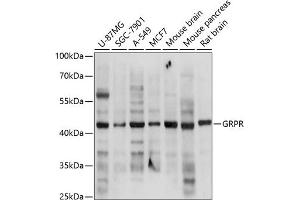 Gastrin-releasing peptide (GRP) regulates numerous functions of the gastrointestinal and central nervous systems, including release of gastrointestinal hormones, smooth muscle cell contraction, and epithelial cell proliferation and is a potent mitogen for neoplastic tissues. The effects of GRP are mediated through the gastrin-releasing peptide receptor. This receptor is a glycosylated, 7-transmembrane G-protein coupled receptor that activates the phospholipase C signaling pathway. The receptor is aberrantly expressed in numerous cancers such as those of the lung, colon, and prostate. An individual with autism and multiple exostoses was found to have a balanced translocation between chromosome 8 and a chromosome X breakpoint located within the gastrin-releasing peptide receptor gene.,GRPR,BB2,BB2R,Signal Transduction,G protein signaling,G-Protein-Coupled Receptors(GPCR),Neuroscience,GRPR