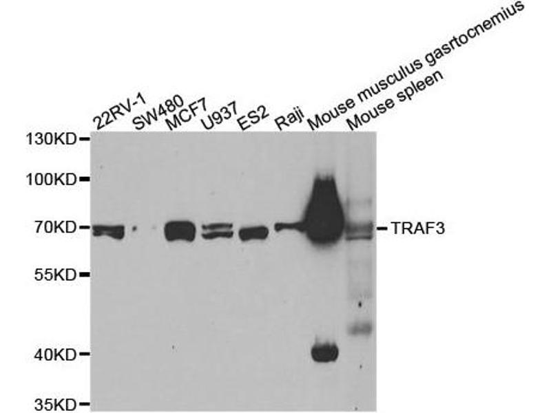 The protein encoded by this gene is a member of the TNF receptor associated factor (TRAF) protein family. TRAF proteins associate with, and mediate the signal transduction from, members of the TNF receptor (TNFR) superfamily. This protein participates in the signal transduction of CD40, a TNFR family member important for the activation of the immune response. This protein is found to be a critical component of the lymphotoxin-beta receptor (LTbetaR) signaling complex, which induces NF-kappaB activation and cell death initiated by LTbeta ligation. Epstein-Barr virus encoded latent infection membrane protein-1 (LMP1) can interact with this and several other members of the TRAF family, which may be essential for the oncogenic effects of LMP1. Several alternatively spliced transcript variants encoding three distinct isoforms have been reported.,TRAF3,CAP-1,CAP1,CD40bp,CRAF1,IIAE5,LAP1,Cancer,Invasion and Metastasis,Signal Transduction,Cell Biology & Developmental Biology,Apoptosis,Death receptors & ligands,Growth factor,TNF,Immunology & Inflammation,Cytokines,TNF,NF-kB Signaling Pathway,Toll-like Receptor Signaling Pathway,Cell Intrinsic Innate Immunity Signaling Pathway,TRAF3