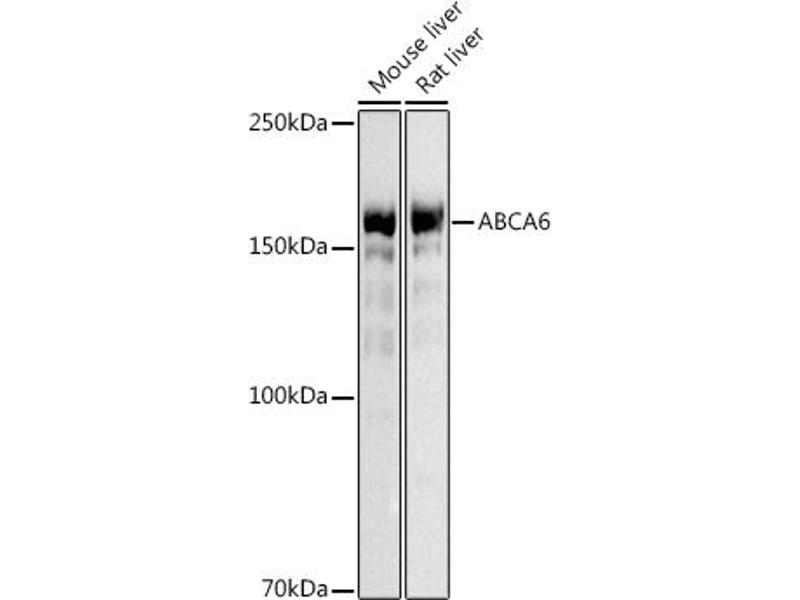 The membrane-associated protein encoded by this gene is a member of the superfamily of ATP-binding cassette (ABC) transporters. ABC proteins transport various molecules across extra- and intracellular membranes. ABC genes are divided into seven distinct subfamilies (ABC1, MDR/TAP, MRP, ALD, OABP, GCN20, and White). This encoded protein is a member of the ABC1 subfamily. Members of the ABC1 subfamily comprise the only major ABC subfamily found exclusively in multicellular eukaryotes. This gene is clustered among 4 other ABC1 family members on 17q24 and may play a role in macrophage lipid homeostasis.,ABCA6,EST155051,Abca6,Signal Transduction,Endocrine & Metabolism,Lipid Metabolism,Cholesterol Metabolism,Cardiovascular,Lipids,Abca6