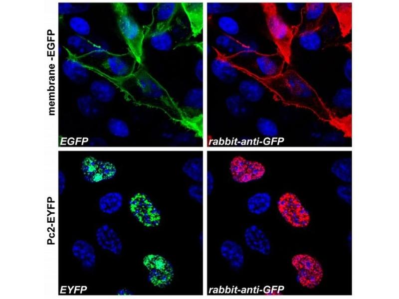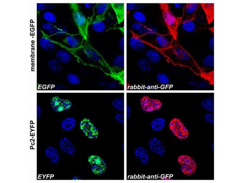 Green fluorescence protein (GFP) is a 27 KDa protein derived from the bioluminiscent jellyfish Aquorea victoria, emiting green light (λ,=509 nm) when excited (excitation by Blue or UV light, absorption peak λ,=395 nm). GFP is a useful tool in cell biology research, as its intrinsic fluorescence can be visualized in living cells. Light-stimulated GFP fluorescence is species-independent and a fluorescence has been reported from many different types of GFP-expressing hosts, including microbes, invertebrates, vertebrates and plants. No exogenous substrates and cofactors are required for the fluorescence of GFP, since GFP autocatalytically forms a fluorescent pigment from natural amino acids present in the nascent protein. GFP fluorescence is stable under fixation conditions and suitable for a variety of applications. GFP is widely used as a reporter (tag) for gene expression, enabling researchers to visualize and localize GFP-tagged proteins within living cells without any further staining. Other applications of GFP include measurement of distance between proteins through fluorescence energy transfer (FRET) protocols. To increase a fluorescence intensity of GFP, chomophore mutations have been created. The EnhancedGFP has a fluorescence 35 times more intense than the wt-GFP. Mutagenesis of GFP has produced also many mutants (e.g. Yellow Fluorescent Protein, Cyan Fluorescent Protein) with warying spectral properties. Antibodies raised against full-length GFP variants should also detect other variants of the protein.