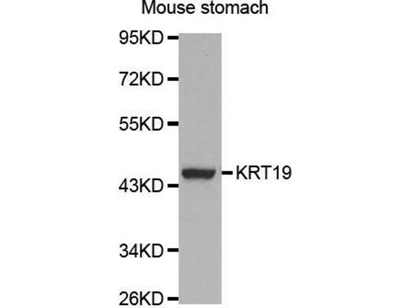 The protein encoded by this gene is a member of the keratin family. The keratins are intermediate filament proteins responsible for the structural integrity of epithelial cells and are subdivided into cytokeratins and hair keratins. The type I cytokeratins consist of acidic proteins which are arranged in pairs of heterotypic keratin chains. Unlike its related family members, this smallest known acidic cytokeratin is not paired with a basic cytokeratin in epithelial cells. It is specifically expressed in the periderm, the transiently superficial layer that envelopes the developing epidermis. The type I cytokeratins are clustered in a region of chromosome 17q12-q21.,CK19,K19,K1CS,KRT19,Signal Transduction,Cell Biology & Developmental Biology,Cytoskeleton,Intermediate Filaments,Extracellular Matrix,Cytokeratin,Keratin,Stem Cells,KRT19