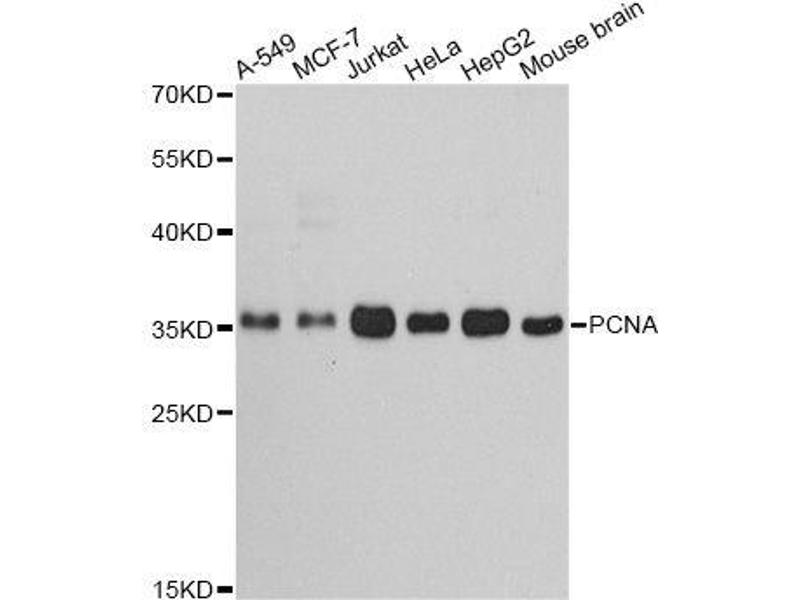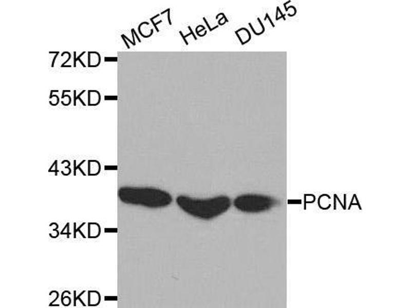 The protein encoded by this gene is found in the nucleus and is a cofactor of DNA polymerase delta. The encoded protein acts as a homotrimer and helps increase the processivity of leading strand synthesis during DNA replication. In response to DNA damage, this protein is ubiquitinated and is involved in the RAD6-dependent DNA repair pathway. Two transcript variants encoding the same protein have been found for this gene. Pseudogenes of this gene have been described on chromosome 4 and on the X chromosome.,PCNA,ATLD2,Epigenetics & Nuclear Signaling,Cancer,Tumor biomarkers,Signal Transduction,ErbB-HER Signaling Pathway,Cell Biology & Developmental Biology,Cell Cycle,Stem Cells,PCNA