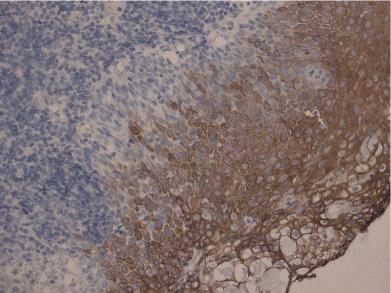 Immunohistochemistry (paraffin sections): Standard ABC technique (DAB+), recommended dilution: 10 μg/mL (1:100), positive tissue: tonsil. Pretreatment: 0.1 % pepsin in 0.1 M HCl for 30 min at room temperature or Target Retrieval Solution - High pH . The antibody DE-K13 reacts exclusively with Cytokeratin 13.