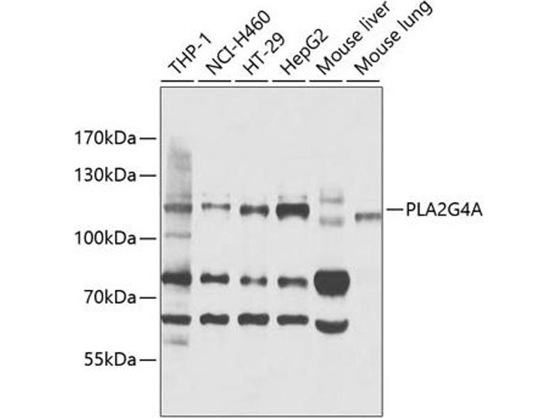 This gene encodes a member of the cytosolic phospholipase A2 group IV family. The enzyme catalyzes the hydrolysis of membrane phospholipids to release arachidonic acid which is subsequently metabolized into eicosanoids. Eicosanoids, including prostaglandins and leukotrienes, are lipid-based cellular hormones that regulate hemodynamics, inflammatory responses, and other intracellular pathways. The hydrolysis reaction also produces lysophospholipids that are converted into platelet-activating factor. The enzyme is activated by increased intracellular Ca(2+) levels and phosphorylation, resulting in its translocation from the cytosol and nucleus to perinuclear membrane vesicles. Alternative splicing results in multiple transcript variants.,PLA2G4A,PLA2G4,cPLA2,cPLA2-alpha,Signal Transduction,G protein signaling,G2/M DNA Damage Checkpoint,Phospholipase Signaling Pathway,MAPK-Erk Signaling Pathway,MAPK-P38 Signaling Pathway,Endocrine & Metabolism,Lipid Metabolism,PLA2G4A