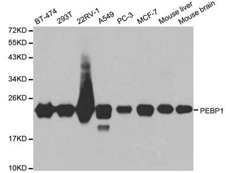 This gene encodes a member of the phosphatidylethanolamine-binding family of proteins and has been shown to modulate multiple signaling pathways, including the MAP kinase (MAPK), NF-kappa B, and glycogen synthase kinase-3 (GSK-3) signaling pathways. The encoded protein can be further processed to form a smaller cleavage product, hippocampal cholinergic neurostimulating peptide (HCNP), which may be involved in neural development. This gene has been implicated in numerous human cancers and may act as a metastasis suppressor gene. Multiple pseudogenes of this gene have been identified in the genome.,PEBP1,HCNP,HCNPpp,HEL-210,HEL-S-34,HEL-S-96,PBP,PEBP,PEBP-1,RKIP,Epigenetics & Nuclear Signaling,RNA Binding,Cancer,Tumor suppressors,Kinase,Cell Biology & Developmental Biology,Cell Cycle,Neuroscience,PEBP1