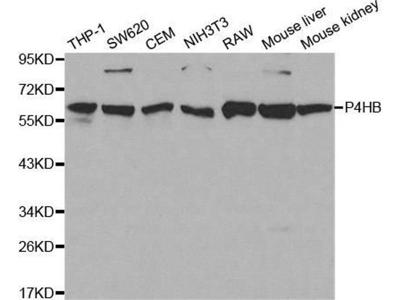 This gene encodes the beta subunit of prolyl 4-hydroxylase, a highly abundant multifunctional enzyme that belongs to the protein disulfide isomerase family. When present as a tetramer consisting of two alpha and two beta subunits, this enzyme is involved in hydroxylation of prolyl residues in preprocollagen. This enzyme is also a disulfide isomerase containing two thioredoxin domains that catalyze the formation, breakage and rearrangement of disulfide bonds. Other known functions include its ability to act as a chaperone that inhibits aggregation of misfolded proteins in a concentration-dependent manner, its ability to bind thyroid hormone, its role in both the influx and efflux of S-nitrosothiol-bound nitric oxide, and its function as a subunit of the microsomal triglyceride transfer protein complex.,P4HB,CLCRP1,DSI,ERBA2L,GIT,P4Hbeta,PDI,PDIA1,PHDB,PO4DB,PO4HB,PROHB,Epigenetics & Nuclear Signaling,RNA Binding,Cancer,Signal Transduction,Cell Biology & Developmental Biology,Cytoskeleton,Extracellular Matrix,Collagen,Endocrine & Metabolism,Lipid Metabolism,P4HB