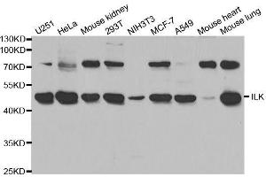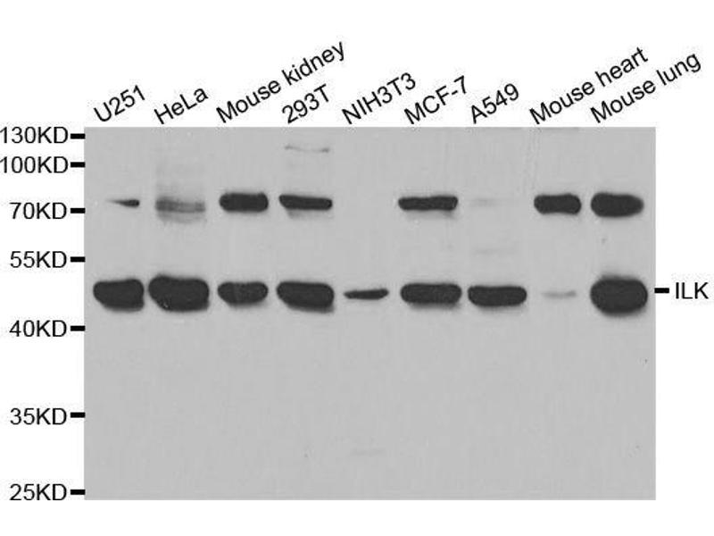 This gene encodes a protein with a kinase-like domain and four ankyrin-like repeats. The encoded protein associates at the cell membrane with the cytoplasmic domain of beta integrins, where it regulates integrin-mediated signal transduction. Activity of this protein is important in the epithelial to mesenchymal transition, and over-expression of this gene is implicated in tumor growth and metastasis. Alternative splicing results in multiple transcript variants.,ILK,HEL-S-28,ILK-1,ILK-2,P59,p59ILK,Signal Transduction,Kinase,Serine/threonine kinases,Tyrosine kinases,PI3K-Akt Signaling Pathway,Cell Biology & Developmental Biology,Cell Cycle,Centrosome,ILK