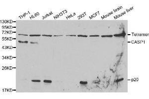 This gene encodes a protein which is a member of the cysteine-aspartic acid protease (caspase) family. Sequential activation of caspases plays a central role in the execution-phase of cell apoptosis. Caspases exist as inactive proenzymes which undergo proteolytic processing at conserved aspartic residues to produce 2 subunits, large and small, that dimerize to form the active enzyme. This gene was identified by its ability to proteolytically cleave and activate the inactive precursor of interleukin-1, a cytokine involved in the processes such as inflammation, septic shock, and wound healing. This gene has been shown to induce cell apoptosis and may function in various developmental stages. Studies of a similar gene in mouse suggest a role in the pathogenesis of Huntington disease. Alternative splicing results in transcript variants encoding distinct isoforms.,CASP1,ICE,IL1BC,P45,caspase-1,Caspase 1,Cancer,Invasion and Metastasis,Signal Transduction,ErbB-HER Signaling Pathway,Cell Biology & Developmental Biology,Apoptosis,Caspases,Endocrine & Metabolism,Immunology & Inflammation,Neuroscience,Neurodegenerative Diseases,CASP1