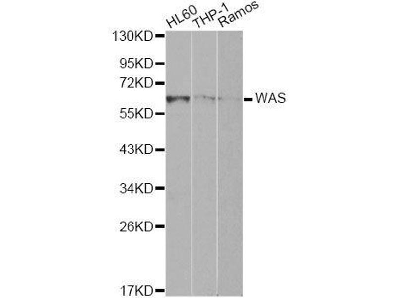 The Wiskott-Aldrich syndrome (WAS) family of proteins share similar domain structure, and are involved in transduction of signals from receptors on the cell surface to the actin cytoskeleton. The presence of a number of different motifs suggests that they are regulated by a number of different stimuli, and interact with multiple proteins. Recent studies have demonstrated that these proteins, directly or indirectly, associate with the small GTPase, Cdc42, known to regulate formation of actin filaments, and the cytoskeletal organizing complex, Arp2/3. Wiskott-Aldrich syndrome is a rare, inherited, X-linked, recessive disease characterized by immune dysregulation and microthrombocytopenia, and is caused by mutations in the WAS gene. The WAS gene product is a cytoplasmic protein, expressed exclusively in hematopoietic cells, which show signalling and cytoskeletal abnormalities in WAS patients. A transcript variant arising as a result of alternative promoter usage, and containing a different 5' UTR sequence, has been described, however, its full-length nature is not known.,WAS,IMD2,SCNX,THC,THC1,WASP,WASPA,Signal Transduction,Cell Biology & Developmental Biology,Cell Adhesion,Cytoskeleton,Actins,Immunology & Inflammation,T Cell Receptor Signaling Pathway,WAS