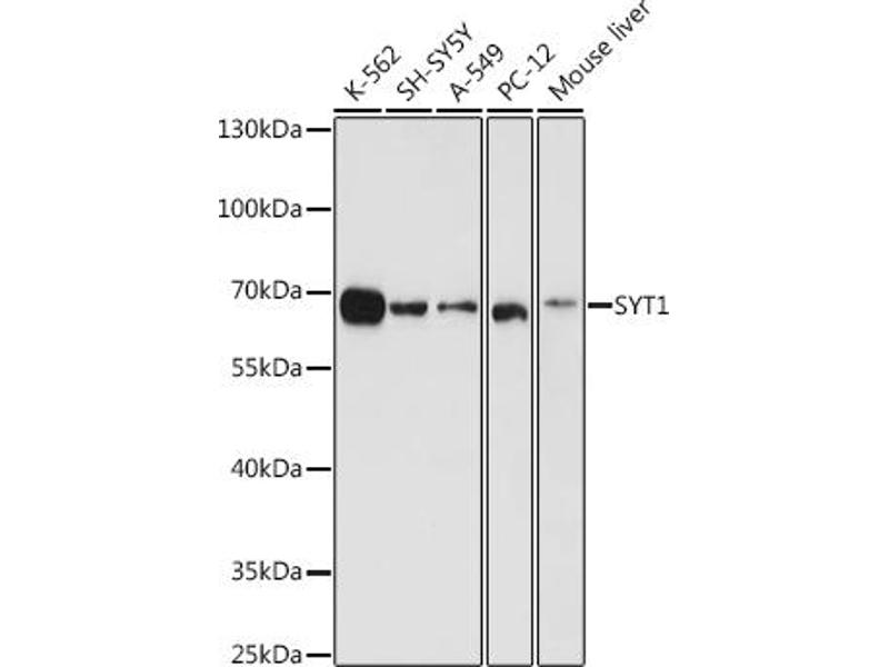 The synaptotagmins are integral membrane proteins of synaptic vesicles thought to serve as Ca(2+) sensors in the process of vesicular trafficking and exocytosis. Calcium binding to synaptotagmin-1 participates in triggering neurotransmitter release at the synapse (Fernandez-Chacon et al., 2001 [PubMed 11242035]).[supplied by OMIM, Jul 2010],SYT1,P65,SVP65,SYT,Signal Transduction,Neuroscience,Cell Type Marker,Neuron marker,Synapse marker,SYT1