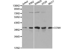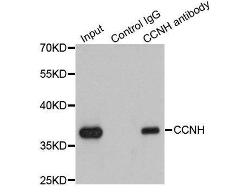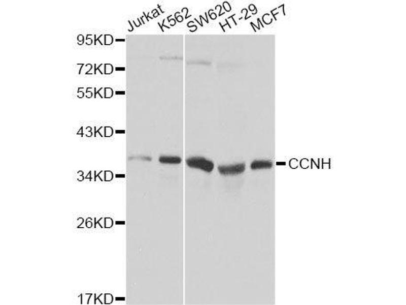 The protein encoded by this gene belongs to the highly conserved cyclin family, whose members are characterized by a dramatic periodicity in protein abundance through the cell cycle. Cyclins function as regulators of CDK kinases. Different cyclins exhibit distinct expression and degradation patterns which contribute to the temporal coordination of each mitotic event. This cyclin forms a complex with CDK7 kinase and ring finger protein MAT1. The kinase complex is able to phosphorylate CDK2 and CDC2 kinases, thus functions as a CDK-activating kinase (CAK). This cyclin and its kinase partner are components of TFIIH, as well as RNA polymerase II protein complexes. They participate in two different transcriptional regulation processes, suggesting an important link between basal transcription control and the cell cycle machinery. A pseudogene of this gene is found on chromosome 4. Alternate splicing results in multiple transcript variants.,CCNH,CAK,CycH,p34,p37,cyclin-H,Epigenetics & Nuclear Signaling,DNA Damage & Repair,Cell Biology & Developmental Biology,Cell Cycle,Cyclins,CCNH