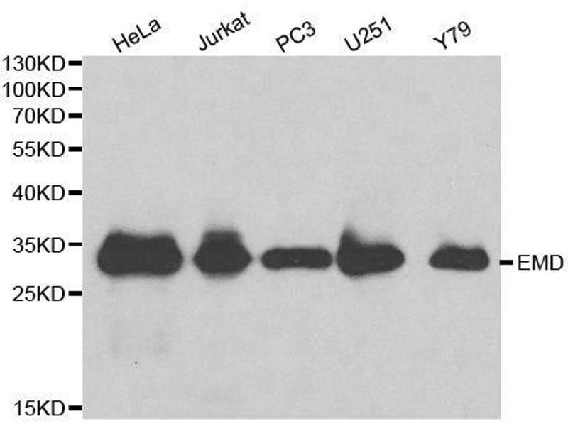Emerin is a serine-rich nuclear membrane protein and a member of the nuclear lamina-associated protein family. It mediates membrane anchorage to the cytoskeleton. Dreifuss-Emery muscular dystrophy is an X-linked inherited degenerative myopathy resulting from mutation in the emerin gene.,EMD,EDMD,LEMD5,STA,emerin,Signal Transduction,Cell Biology & Developmental Biology,Cytoskeleton,Intermediate Filaments,EMD
