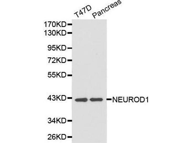 This gene encodes a member of the NeuroD family of basic helix-loop-helix (bHLH) transcription factors. The protein forms heterodimers with other bHLH proteins and activates transcription of genes that contain a specific DNA sequence known as the E-box. It regulates expression of the insulin gene, and mutations in this gene result in type II diabetes mellitus.,NEUROD1,BETA2,BHF-1,MODY6,NEUROD,bHLHa3,Epigenetics & Nuclear Signaling,Transcription Factors,Cancer,Endocrine & Metabolism,Endocrine and metabolic diseases,Diabetes,Neuroscience,Cell Type Marker,Cardiovascular,Heart,Cardiovascular diseases,Heart disease,Neural Stem Cell marker,NEUROD1