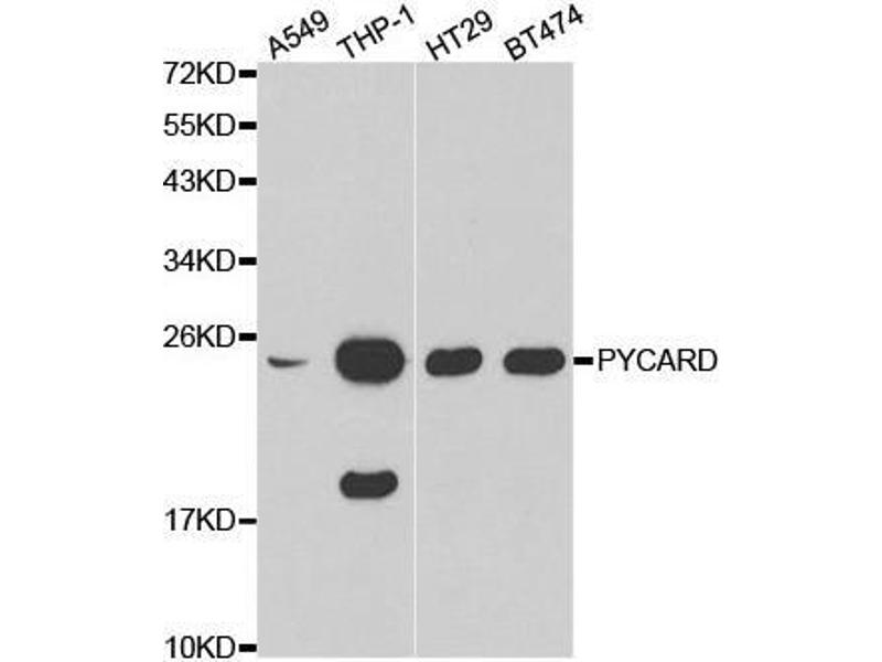 This gene encodes an adaptor protein that is composed of two protein-protein interaction domains: a N-terminal PYRIN-PAAD-DAPIN domain (PYD) and a C-terminal caspase-recruitment domain (CARD). The PYD and CARD domains are members of the six-helix bundle death domain-fold superfamily that mediates assembly of large signaling complexes in the inflammatory and apoptotic signaling pathways via the activation of caspase. In normal cells, this protein is localized to the cytoplasm, however, in cells undergoing apoptosis, it forms ball-like aggregates near the nuclear periphery. Two transcript variants encoding different isoforms have been found for this gene.,PYCARD,ASC,CARD5,TMS,TMS-1,TMS1,PYD and CARD domain containing,ASC / TMS1,Cancer,Tumor biomarkers,Cell Biology & Developmental Biology,Apoptosis,Caspases,PYCARD