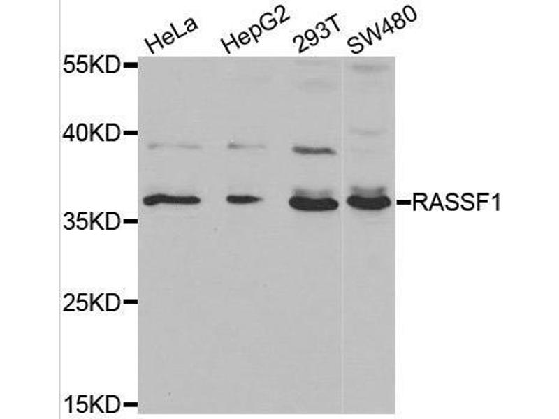 Der Kaninchen Polyklonal anti-RASSF1 Antikörper (ABIN3021712) detektiert spezifisch RASSF1 in WB.
