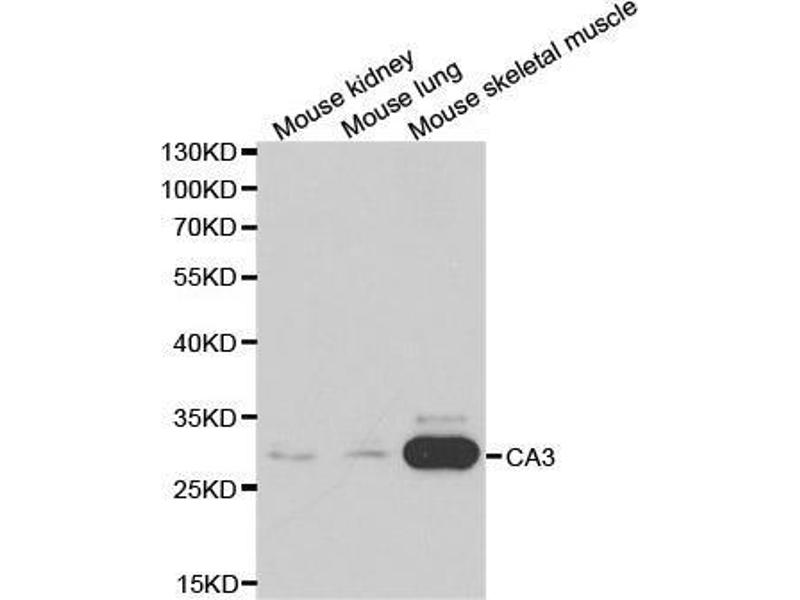 Carbonic anhydrase III (CAIII) is a member of a multigene family (at least six separate genes are known) that encodes carbonic anhydrase isozymes. These carbonic anhydrases are a class of metalloenzymes that catalyze the reversible hydration of carbon dioxide and are differentially expressed in a number of cell types. The expression of the CA3 gene is strictly tissue specific and present at high levels in skeletal muscle and much lower levels in cardiac and smooth muscle. A proportion of carriers of Duchenne muscle dystrophy have a higher CA3 level than normal. The gene spans 10.3 kb and contains seven exons and six introns.,CA3,CAIII,Car3,Cell Biology & Developmental Biology,Cardiovascular,Hypoxia,CA3