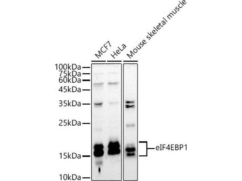 This gene encodes one member of a family of translation repressor proteins. The protein directly interacts with eukaryotic translation initiation factor 4E (eIF4E), which is a limiting component of the multisubunit complex that recruits 40S ribosomal subunits to the 5' end of mRNAs. Interaction of this protein with eIF4E inhibits complex assembly and represses translation. This protein is phosphorylated in response to various signals including UV irradiation and insulin signaling, resulting in its dissociation from eIF4E and activation of mRNA translation.,4E-BP1,4EBP1,BP-1,PHAS-I,EIF4EBP1,Epigenetics & Nuclear Signaling,Translation Control,Regulation of eIF4 and p70 S6 Kinase,Signal Transduction,PI3K-Akt Signaling Pathway,mTOR Signaling Pathway,Endocrine & Metabolism,AMPK Signaling Pathway,Insulin Receptor Signaling Pathway,Endocrine and metabolic diseases,Diabetes,Metabolic disorders,Obesity,Cardiovascular,Angiogenesis,Akt downstream targets,EIF4EBP1