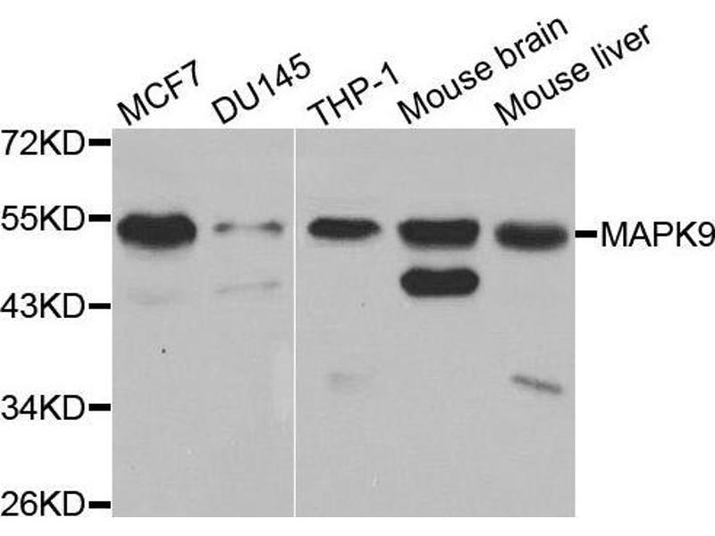 The protein encoded by this gene is a member of the MAP kinase family. MAP kinases act as an integration point for multiple biochemical signals, and are involved in a wide variety of cellular processes such as proliferation, differentiation, transcription regulation and development. This kinase targets specific transcription factors, and thus mediates immediate-early gene expression in response to various cell stimuli. It is most closely related to MAPK8, both of which are involved in UV radiation induced apoptosis, thought to be related to the cytochrome c-mediated cell death pathway. This gene and MAPK8 are also known as c-Jun N-terminal kinases. This kinase blocks the ubiquitination of tumor suppressor p53, and thus it increases the stability of p53 in nonstressed cells. Studies of this gene's mouse counterpart suggest a key role in T-cell differentiation. Several alternatively spliced transcript variants encoding distinct isoforms have been reported.,MAPK9,JNK-55,JNK2,JNK2A,JNK2ALPHA,JNK2B,JNK2BETA,PRKM9,SAPK,SAPK1a,p54a,p54aSAPK,Cancer,Tumor biomarkers,Signal Transduction,Kinase,Serine/threonine kinases,ErbB-HER Signaling Pathway,MAPK-JNK Signaling Pathway,Cell Biology & Developmental Biology,Apoptosis,Mitochondrial Control of Apoptosis,Inhibition of Apoptosis,Death Receptor Signaling Pathway,TGF-b-Smad Signaling Pathway,Endocrine & Metabolism,Insulin Receptor Signaling Pathway,Immunology & Inflammation,B Cell Receptor Signaling Pathway,T Cell Receptor Signaling Pathway,NF-kB Signaling Pathway,Toll-like Receptor Signaling Pathway,Cell Intrinsic Innate Immunity Signaling Pathway,TLR Signaling,Neuroscience,Neurodegenerative Diseases,Dopamine Signaling in Parkinson's Disease,MAPK9