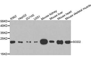 This gene is a member of the iron/manganese superoxide dismutase family. It encodes a mitochondrial protein that forms a homotetramer and binds one manganese ion per subunit. This protein binds to the superoxide byproducts of oxidative phosphorylation and converts them to hydrogen peroxide and diatomic oxygen. Mutations in this gene have been associated with idiopathic cardiomyopathy (IDC), premature aging, sporadic motor neuron disease, and cancer. Alternative splicing of this gene results in multiple transcript variants. A related pseudogene has been identified on chromosome 1.,IPO-B,IPOB,MNSOD,MVCD6,Mn-SOD,SOD2,Cancer,Signal Transduction,Cell Biology & Developmental Biology,Apoptosis,Endocrine & Metabolism,Mitochondrial metabolism,Mitochondrial markers,Neuroscience,Neurodegenerative Diseases,Cardiovascular,Hypoxia,SOD2