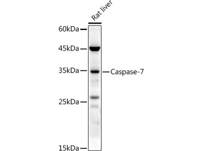 This gene encodes a member of the cysteine-aspartic acid protease (caspase) family. Sequential activation of caspases plays a central role in the execution-phase of cell apoptosis. Caspases exist as inactive proenzymes which undergo proteolytic processing at conserved aspartic residues to produce two subunits, large and small, that dimerize to form the active enzyme. The precursor of the encoded protein is cleaved by caspase 3 and 10, is activated upon cell death stimuli and induces apoptosis. Alternatively spliced transcript variants encoding multiple isoforms have been observed for this gene.,CASP7,CASP-7,CMH-1,ICE-LAP3,LICE2,MCH3,caspase-7,Casp7,Cancer,Invasion and Metastasis,Signal Transduction,ErbB-HER Signaling Pathway,Cell Biology & Developmental Biology,Apoptosis,Caspases,Inhibition of Apoptosis,Death Receptor Signaling Pathway,Endocrine & Metabolism,Neuroscience,Neurodegenerative Diseases,Casp7