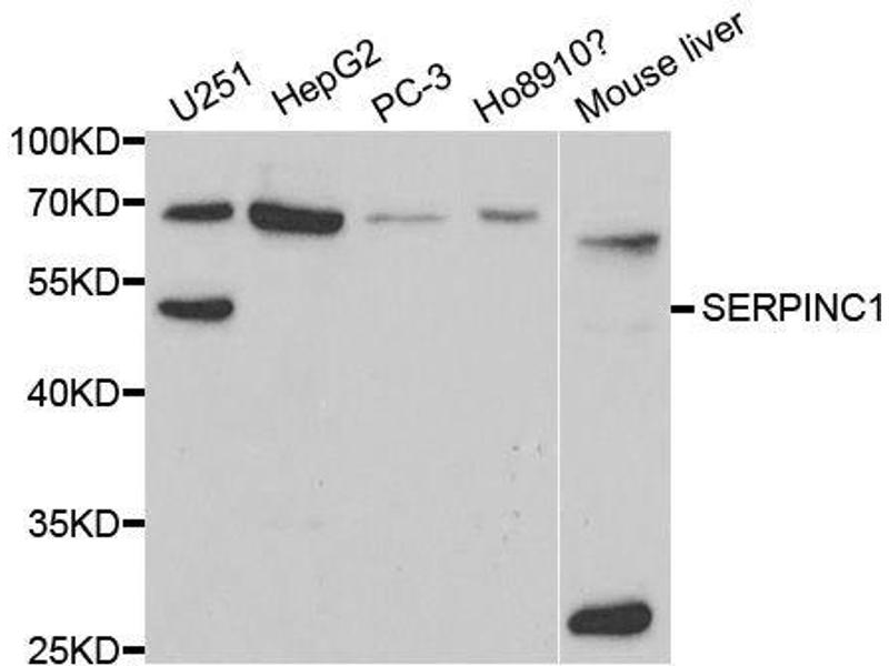 The protein encoded by this gene is a plasma protease inhibitor and a member of the serpin superfamily. This protein inhibits thrombin as well as other activated serine proteases of the coagulation system, and it regulates the blood coagulation cascade. The protein includes two functional domains: the heparin binding-domain at the N-terminus of the mature protein, and the reactive site domain at the C-terminus. The inhibitory activity is enhanced by the presence of heparin. More than 120 mutations have been identified for this gene, many of which are known to cause antithrombin-III deficiency.,SERPINC1,AT3,AT3D,ATIII,THPH7,Stem Cells,Cardiovascular,Blood,Coagulation,Serum Proteins,SERPINC1