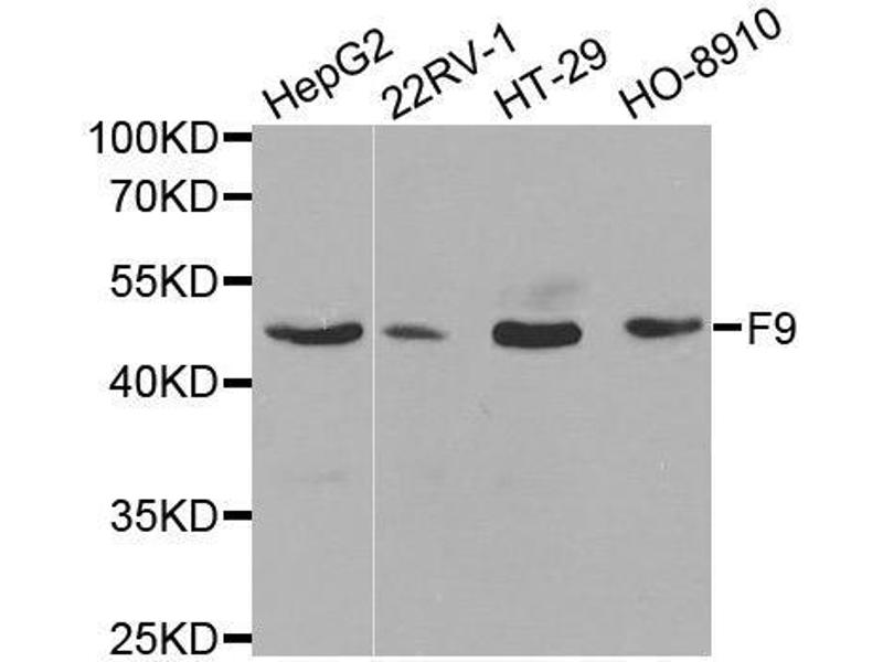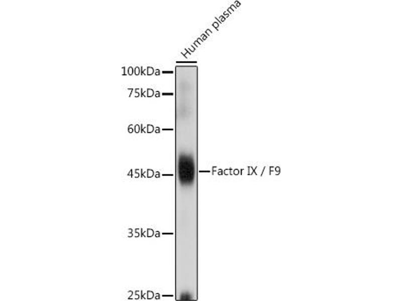 This gene encodes vitamin K-dependent coagulation factor IX that circulates in the blood as an inactive zymogen. This factor is converted to an active form by factor XIa, which excises the activation peptide and thus generates a heavy chain and a light chain held together by one or more disulfide bonds. The role of this activated factor IX in the blood coagulation cascade is to activate factor X to its active form through interactions with Ca+2 ions, membrane phospholipids, and factor VIII. Alterations of this gene, including point mutations, insertions and deletions, cause factor IX deficiency, which is a recessive X-linked disorder, also called hemophilia B or Christmas disease. Alternative splicing results in multiple transcript variants encoding different isoforms that may undergo similar proteolytic processing.,F9,F9 p22,FIX,HEMB,P19,PTC,THPH8,F9p22,Immunology & Inflammation,Cell Intrinsic Innate Immunity Signaling Pathway,Cardiovascular,Blood,Coagulation,F9