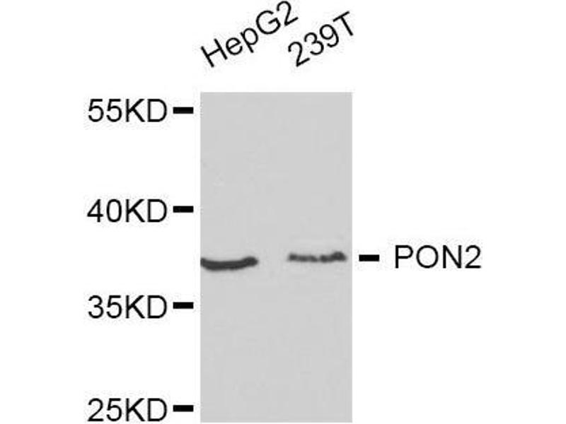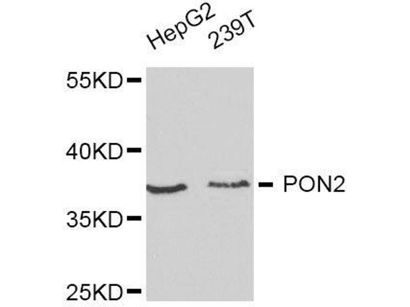 This gene encodes a member of the paraoxonase gene family, which includes three known members located adjacent to each other on the long arm of chromosome 7. The encoded protein is ubiquitously expressed in human tissues, membrane-bound, and may act as a cellular antioxidant, protecting cells from oxidative stress. Hydrolytic activity against acylhomoserine lactones, important bacterial quorum-sensing mediators, suggests the encoded protein may also play a role in defense responses to pathogenic bacteria. Mutations in this gene may be associated with vascular disease and a number of quantitative phenotypes related to diabetes. Alternatively spliced transcript variants encoding different isoforms have been described.,PON2,Cancer,Signal Transduction,Endocrine & Metabolism,Drug metabolism,Neuroscience,Neurodegenerative Diseases,Dopamine Signaling in Parkinson's Disease,Cardiovascular,Lipids,Lipoproteins/Apolipoproteins,PON2