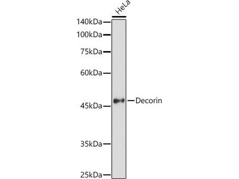 This gene encodes a member of the small leucine-rich proteoglycan family of proteins. Alternative splicing results in multiple transcript variants, at least one of which encodes a preproprotein that is proteolytically processed to generate the mature protein. This protein plays a role in collagen fibril assembly. Binding of this protein to multiple cell surface receptors mediates its role in tumor suppression, including a stimulatory effect on autophagy and inflammation and an inhibitory effect on angiogenesis and tumorigenesis. This gene and the related gene biglycan are thought to be the result of a gene duplication. Mutations in this gene are associated with congenital stromal corneal dystrophy in human patients.,DCN,CSCD,DSPG2,PG40,PGII,PGS2,SLRR1B,decorin,Decorin,Epigenetics & Nuclear Signaling,RNA Binding,Signal Transduction,Cell Biology & Developmental Biology,Cytoskeleton,Extracellular Matrix,Collagen,Bone,Stem Cells,Mesenchymal Stem Cells,DCN