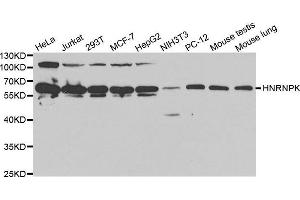 - This gene belongs to the subfamily of ubiquitously expressed heterogeneous nuclear ribonucleoproteins (hnRNPs). The hnRNPs are RNA binding proteins and they complex with heterogeneous nuclear RNA (hnRNA). These proteins are associated with pre-mRNAs in the nucleus and appear to influence pre-mRNA processing and other aspects of mRNA metabolism and transport. While all of the hnRNPs are present in the nucleus, some seem to shuttle between the nucleus and the cytoplasm. The hnRNP proteins have distinct nucleic acid binding properties. The protein encoded by this gene is located in the nucleoplasm and has three repeats of KH domains that binds to RNAs. It is distinct among other hnRNP proteins in its binding preference, it binds tenaciously to poly(C). This protein is also thought to have a role during cell cycle progession. Several alternatively spliced transcript variants have been described for this gene, however, not all of them are fully characterized.,HNRNPK,AUKS,CSBP,HNRPK,TUNP,Epigenetics & Nuclear Signaling,RNA Binding,HNRNPK