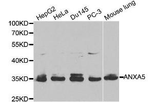 The protein encoded by this gene belongs to the annexin family of calcium-dependent phospholipid binding proteins some of which have been implicated in membrane-related events along exocytotic and endocytotic pathways. Annexin 5 is a phospholipase A2 and protein kinase C inhibitory protein with calcium channel activity and a potential role in cellular signal transduction, inflammation, growth and differentiation. Annexin 5 has also been described as placental anticoagulant protein I, vascular anticoagulant-alpha, endonexin II, lipocortin V, placental protein 4 and anchorin CII. The gene spans 29 kb containing 13 exons, and encodes a single transcript of approximately 1.6 kb and a protein product with a molecular weight of about 35 kDa.,ANXA5,ANX5,ENX2,HEL-S-7,PP4,RPRGL3,Cancer,Invasion and Metastasis,Cell Biology & Developmental Biology,Apoptosis,Cardiovascular,ANXA5