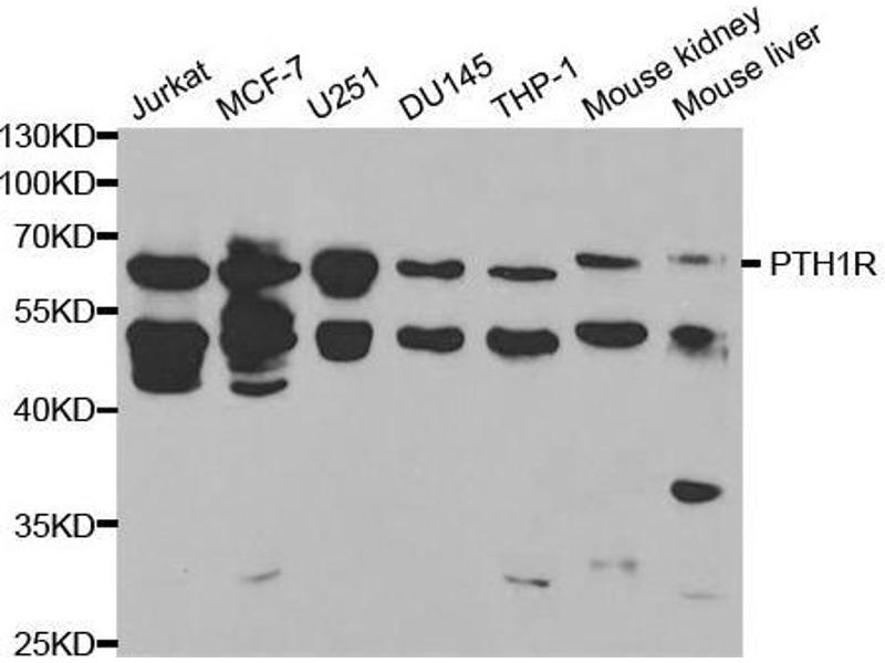 The protein encoded by this gene is a member of the G-protein coupled receptor family 2. This protein is a receptor for parathyroid hormone (PTH) and for parathyroid hormone-like hormone (PTHLH). The activity of this receptor is mediated by G proteins which activate adenylyl cyclase and also a phosphatidylinositol-calcium second messenger system. Defects in this receptor are known to be the cause of Jansen's metaphyseal chondrodysplasia (JMC), chondrodysplasia Blomstrand type (BOCD), as well as enchodromatosis. Two transcript variants encoding the same protein have been found for this gene.,PTH1R,PFE,PTHR,PTHR1,Signal Transduction,Cell Biology & Developmental Biology,Growth factor,Endocrine & Metabolism,Neuroscience,PTH1R