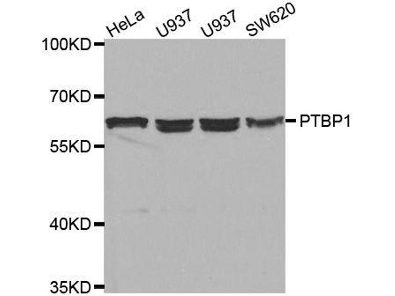 This gene belongs to the subfamily of ubiquitously expressed heterogeneous nuclear ribonucleoproteins (hnRNPs). The hnRNPs are RNA-binding proteins and they complex with heterogeneous nuclear RNA (hnRNA). These proteins are associated with pre-mRNAs in the nucleus and appear to influence pre-mRNA processing and other aspects of mRNA metabolism and transport. While all of the hnRNPs are present in the nucleus, some seem to shuttle between the nucleus and the cytoplasm. The hnRNP proteins have distinct nucleic acid binding properties. The protein encoded by this gene has four repeats of quasi-RNA recognition motif (RRM) domains that bind RNAs. This protein binds to the intronic polypyrimidine tracts that requires pre-mRNA splicing and acts via the protein degradation ubiquitin-proteasome pathway. It may also promote the binding of U2 snRNP to pre-mRNAs. This protein is localized in the nucleoplasm and it is also detected in the perinucleolar structure. Alternatively spliced transcript variants encoding different isoforms have been described.,PTBP1,HNRNP-I,HNRNPI,HNRPI,PTB,PTB-1,PTB-T,PTB2,PTB3,PTB4,pPTB,Epigenetics & Nuclear Signaling,RNA Binding,PTBP1