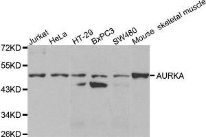 The protein encoded by this gene is a cell cycle-regulated kinase that appears to be involved in microtubule formation and/or stabilization at the spindle pole during chromosome segregation. The encoded protein is found at the centrosome in interphase cells and at the spindle poles in mitosis. This gene may play a role in tumor development and progression. A processed pseudogene of this gene has been found on chromosome 1, and an unprocessed pseudogene has been found on chromosome 10. Multiple transcript variants encoding the same protein have been found for this gene.,AURKA,AIK,ARK1,AURA,BTAK,PPP1R47,STK15,STK6,STK7,Epigenetics & Nuclear Signaling,Cancer,Tumor biomarkers,Signal Transduction,Kinase,Serine/threonine kinases,Cell Biology & Developmental Biology,Cell Cycle,Centrosome,G2/M DNA Damage Checkpoint,AURKA
