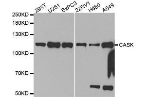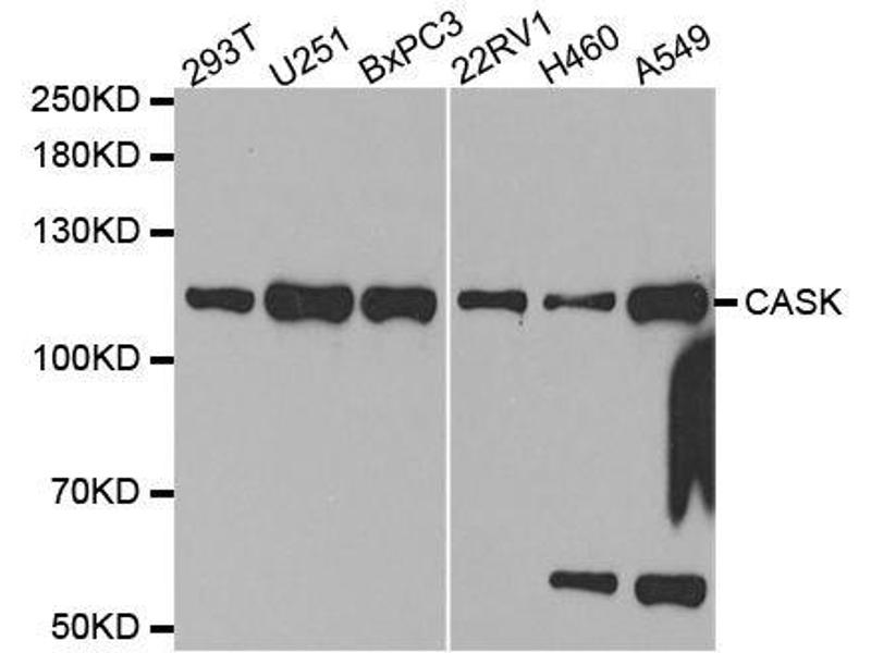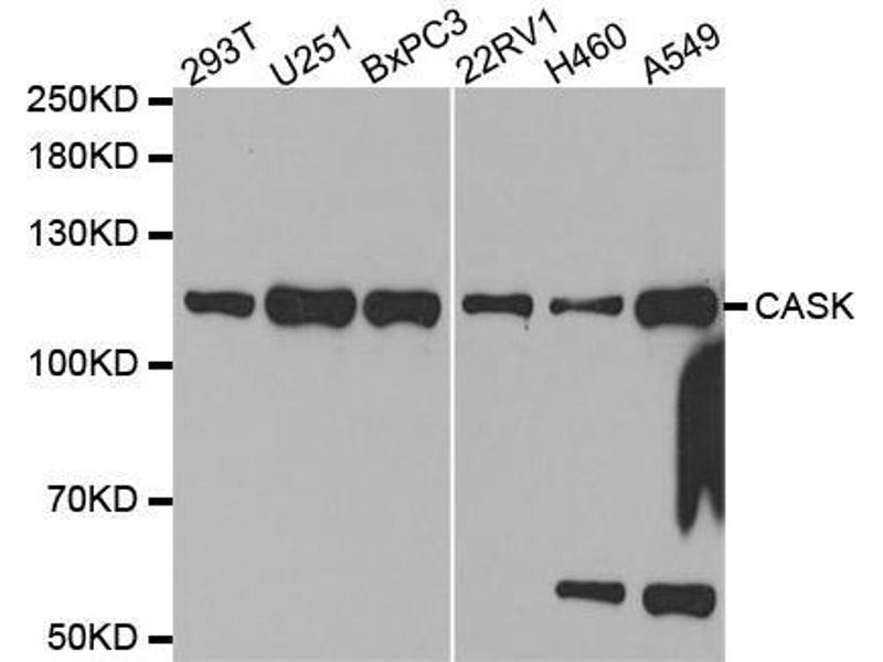This gene encodes a calcium/calmodulin-dependent serine protein kinase. The encoded protein is a MAGUK (membrane-associated guanylate kinase) protein family member. These proteins are scaffold proteins and the encoded protein is located at synapses in the brain. Mutations in this gene are associated with FG syndrome 4, mental retardation and microcephaly with pontine and cerebellar hypoplasia, and a form of X-linked mental retardation. Multiple transcript variants encoding different isoforms have been found for this gene.,CASK,CAGH39,CAMGUK,CMG,FGS4,LIN2,MICPCH,MRXSNA,TNRC8,Signal Transduction,Kinase,Neuroscience,Cell Type Marker,Calcium Signaling,Neuron marker,Synapse marker,CASK