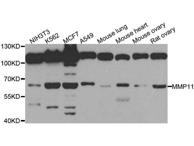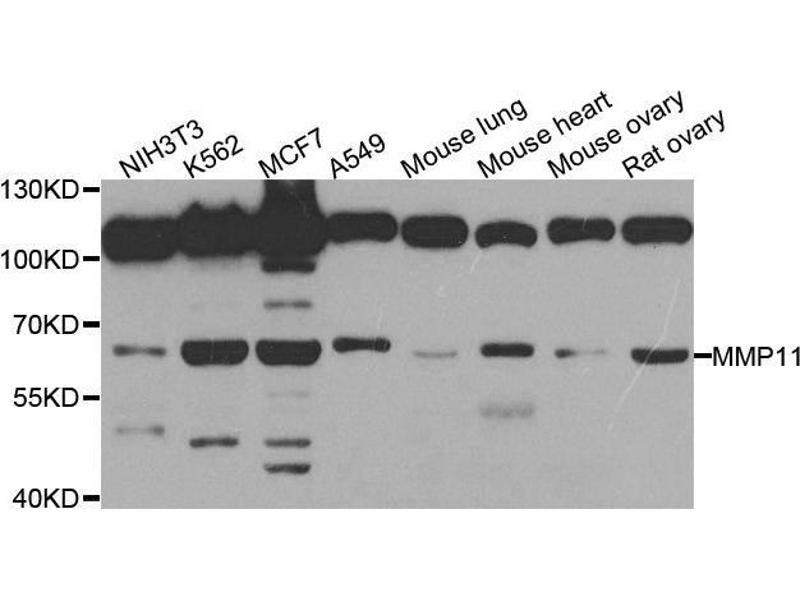 Proteins of the matrix metalloproteinase (MMP) family are involved in the breakdown of extracellular matrix in normal physiological processes, such as embryonic development, reproduction, and tissue remodeling, as well as in disease processes, such as arthritis and metastasis. Most MMP's are secreted as inactive proproteins which are activated when cleaved by extracellular proteinases. However, the enzyme encoded by this gene is activated intracellularly by furin within the constitutive secretory pathway. Also in contrast to other MMP's, this enzyme cleaves alpha 1-proteinase inhibitor but weakly degrades structural proteins of the extracellular matrix.,MMP11,SL-3,ST3,STMY3,Cancer,Invasion and Metastasis,Signal Transduction,Cell Biology & Developmental Biology,Cytoskeleton,Extracellular Matrix,MMPs,Ubiquitin,Cardiovascular,Angiogenesis,MMP11