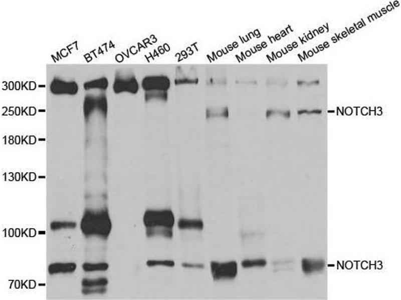 This gene encodes the third discovered human homologue of the Drosophilia melanogaster type I membrane protein notch. In Drosophilia, notch interaction with its cell-bound ligands (delta, serrate) establishes an intercellular signalling pathway that plays a key role in neural development. Homologues of the notch-ligands have also been identified in human, but precise interactions between these ligands and the human notch homologues remains to be determined. Mutations in NOTCH3 have been identified as the underlying cause of cerebral autosomal dominant arteriopathy with subcortical infarcts and leukoencephalopathy (CADASIL).,NOTCH3,CADASIL,CADASIL1,CASIL,IMF2,LMNS,notch 3,Epigenetics & Nuclear Signaling,Transcription Factors,Signal Transduction,Cell Biology & Developmental Biology,Cell Cycle,Cell differentiation,Notch Signaling Pathway,ESC Pluripotency and Differentiation,Neuroscience,Stem Cells,Hematopoietic Progenitors,Neural Stem Cells,Cardiovascular,Heart,Cardiogenesis,NOTCH3