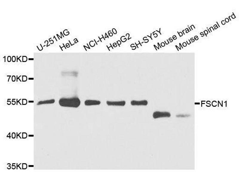This gene encodes a member of the fascin family of actin-binding proteins. Fascin proteins organize F-actin into parallel bundles, and are required for the formation of actin-based cellular protrusions. The encoded protein plays a critical role in cell migration, motility, adhesion and cellular interactions. Expression of this gene is known to be regulated by several microRNAs, and overexpression of this gene may play a role in the metastasis of multiple types of cancer by increasing cell motility. Expression of this gene is also a marker for Reed-Sternberg cells in Hodgkin's lymphoma. A pseudogene of this gene is located on the long arm of chromosome 15.,FSCN1,FAN1,HSN,SNL,p55,fascin,Epigenetics & Nuclear Signaling,RNA Binding,Signal Transduction,Cell Biology & Developmental Biology,Cytoskeleton,Microfilaments,Actins,FSCN1