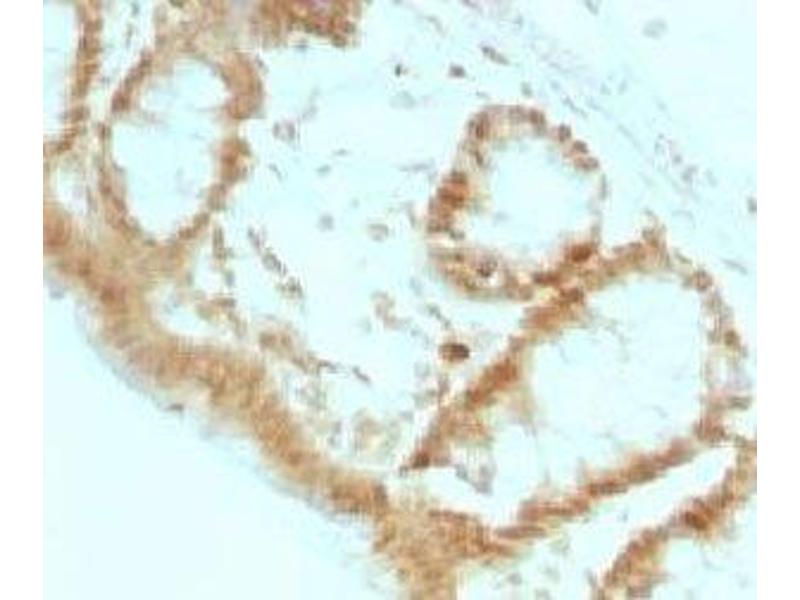 This mAb recognizes a 27 kDa protein, identified as the p27Kip1, a cell cycle regulatory mitotic inhibitor. It is highly specific and shows no cross-reaction with other related mitotic inhibitors. p27Kip1 functions as a negative regulator of G1 progression and has been proposed to function as a possible mediator of TGF- induced G1 arrest. p27Kip1 is a candidate tumor suppressor gene. This mAb is excellent for staining of formalin-fixed tissues.