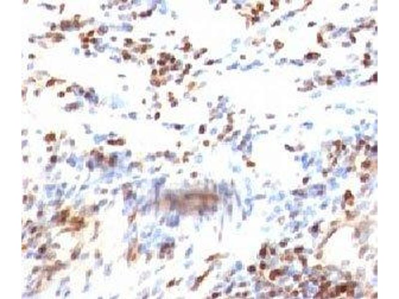 This mAb recognizes a 27  kDa protein, identified as the p27Kip1, a cell cycle regulatory mitotic inhibitor. It is highly specific and shows no cross-reaction with other related mitotic inhibitors. p27Kip1 functions as a negative regulator of G1 progression and has been proposed to function as a possible mediator of TGF- induced G1 arrest. p27Kip1 is a candidate tumor suppressor gene. This mAb is excellent for staining of formalin-fixed tissues.